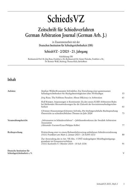 Here you will find the preview of SchiedsVZ, issue 2/2025. The DIS and Verlag C. H. Beck are co-publishers of the German Arbitration Journal (SchiedsVZ). By the way, the subscription to the German Arbitration Journal is free of charge for DIS members.