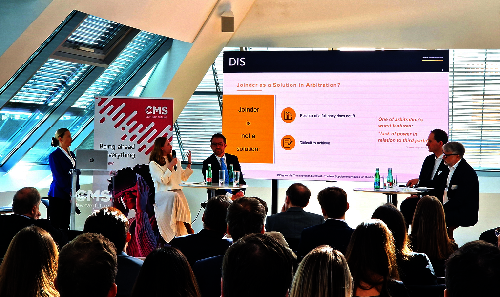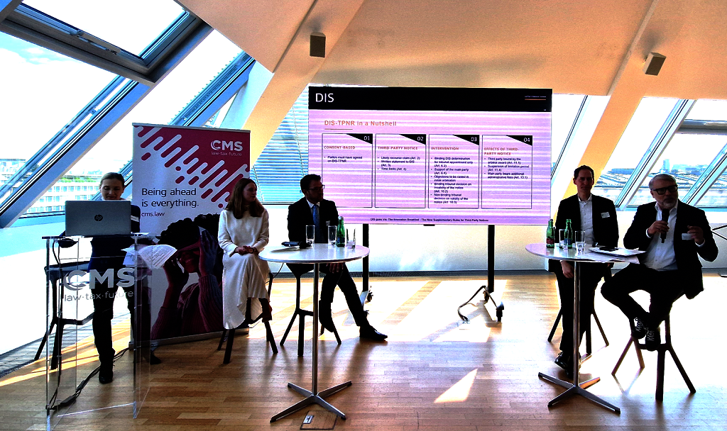 Stefan Kröll (DIS) welcomed the attendees and emphasised for how long DIS has been supporting the Vis Moot Court. He also stressed the innovative character of the DIS-TPNR which were subsequently presented and discussed by a panel moderated by Daniela Karollus-Bruner (CMS Reich-Rohrwig Hainz). Anna Kaehlbrandt (Hengeler Mueller) and Reinmar Wolff (DIS) introduced the set of rules and their background, Florian Cahn (Framatome) contributed from an inhouse perspective and explained the companies' need for a tool binding third parties to arbitral awards.