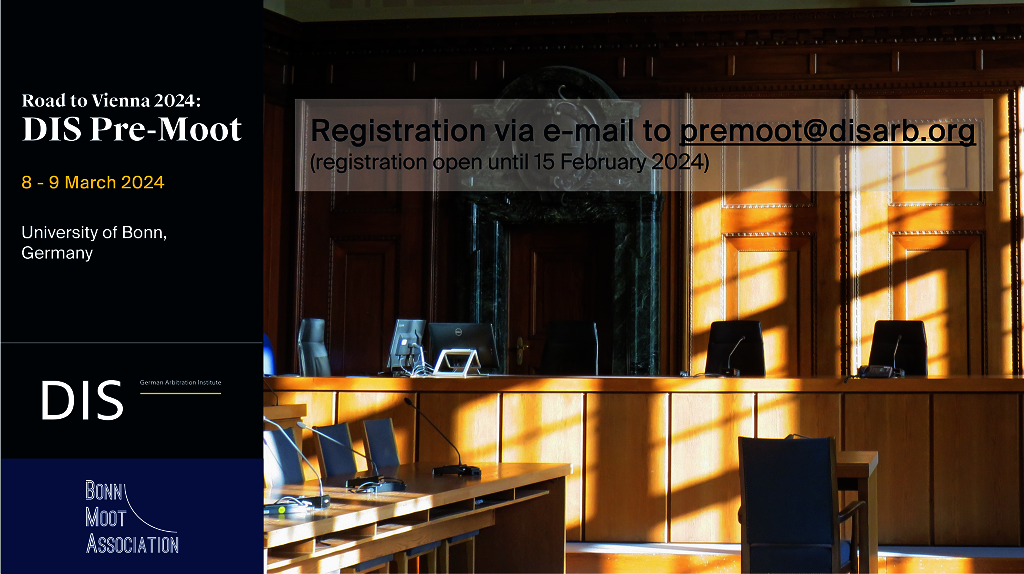 We are pleased to announce the DIS Pre-Moot Bonn, jointly organized by the German Arbitration Institute (DIS) and the Bonn Moot Association (BMA).