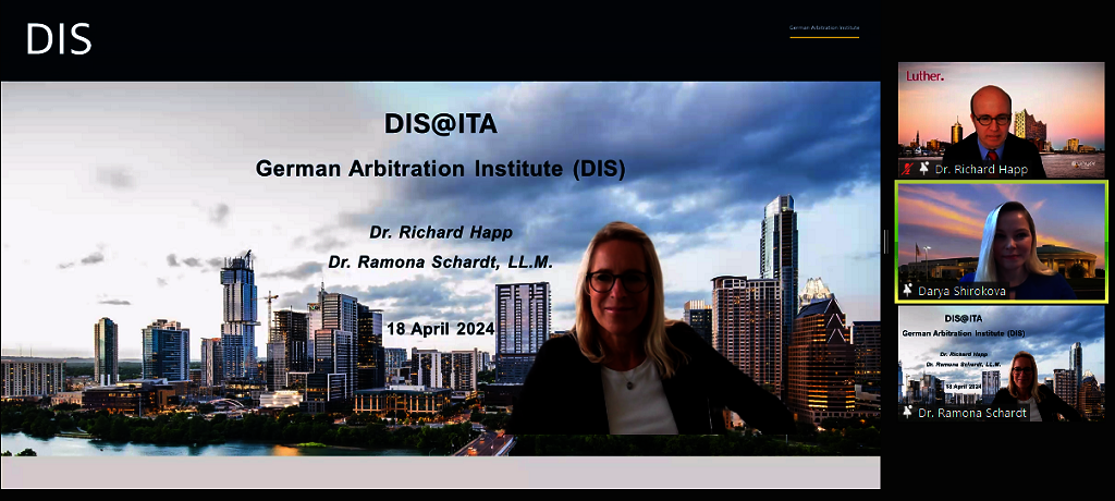 In the webinar, held on 18 April 2024, by the ITA Institute for Transnational Arbitration, Ramona Schardt and Richard Happ presented the DIS and its unique features to an international audience.