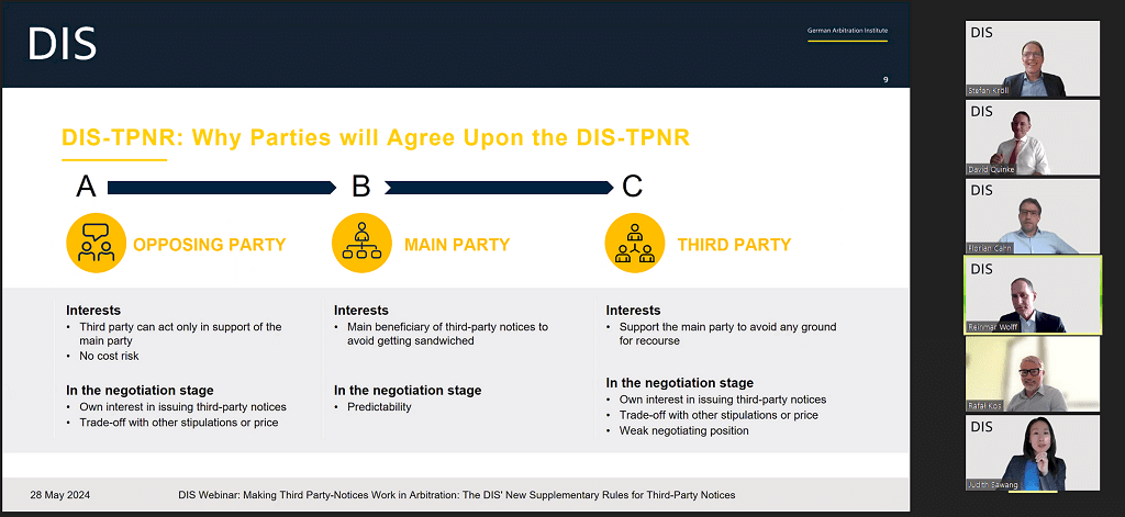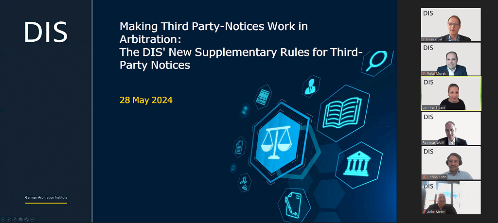 DIS hosted two webinars explaining the DIS-TPNR. Following an introduction of the DIS and its dispute-resolution rules by Jennifer Bryant and Judith Sawang respectively, Stefan Kröll assumed the role of the talkmaster. Florian Cahn explained the problem of a party "sandwiched" between initial dispute and recourse proceedings and the need of companies for ready-made solutions. Rafał Kos and Rafał Morek provided the international perspective on the DIS-TPNR and confirmed that the DIS-TPNR will work in cross-border disputes. Anke Meier, David Quinke and Reinmar Wolff explained the functioning of and the considerations behind these rules.