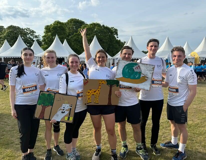 This year, there were 10,588 participants from 361 companies. The DIS was amongst them, represented by seven enthusiastic runners in white DIS sport shirts. During the run, they were cheered on by supportive colleagues holding up handmade posters. The sun was shining brightly making the event even more delightful.