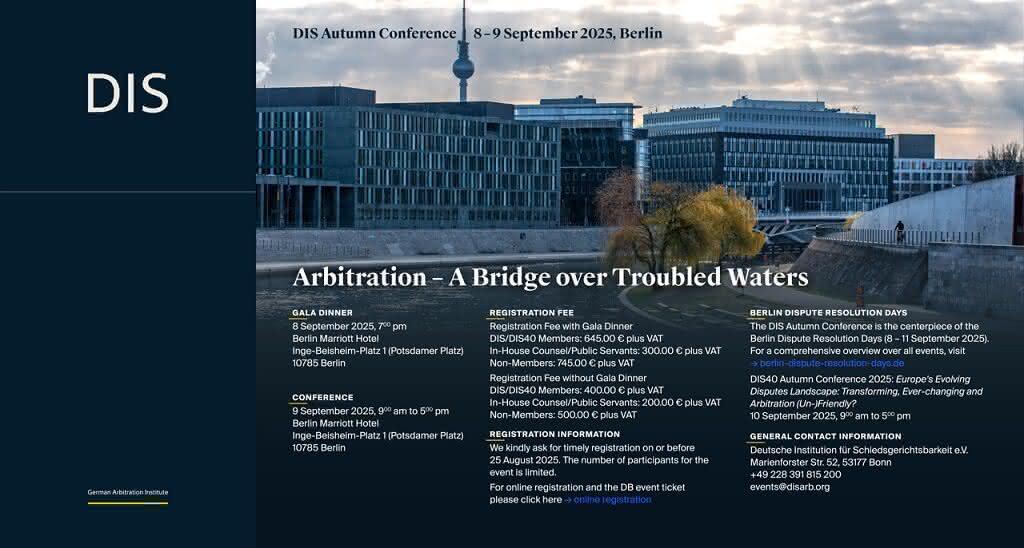 We cordially invite you to the DIS Autumn Conference 2025, which this year will be dealing with the topic "Arbitration – A Bridge over Troubled Waters".