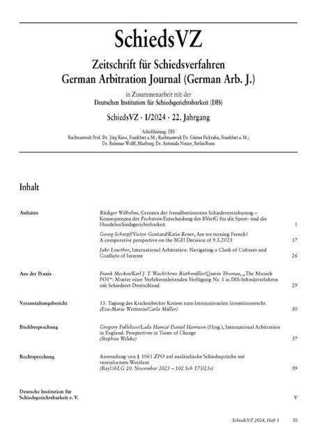 Hier finden Sie das Titelblatt und das Inhaltsverzeichnis der SchiedsVZ, Heft 01/2024. Der Bezug der SchiedsVZ, die im Verlag C. H. Beck erscheint, ist für DIS-Mitglieder übrigens kostenfrei.