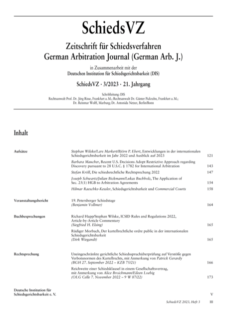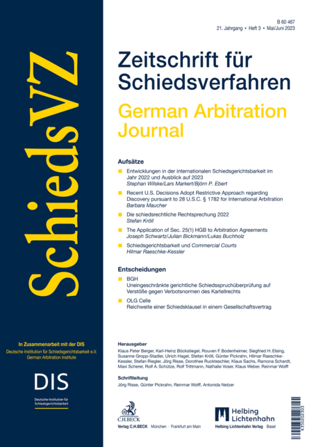 Hier finden Sie das Titelblatt und das Inhaltsverzeichnis der SchiedsVZ, Heft 03/2023. Der Bezug der SchiedsVZ, die im Verlag C. H. Beck erscheint, ist für DIS-Mitglieder übrigens kostenfrei.
