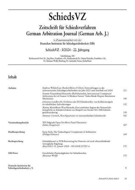 Hier finden Sie das Titelblatt der SchiedsVZ, Heft 03/2024. Der Bezug der SchiedsVZ, die im Verlag C. H. Beck erscheint, ist für DIS-Mitglieder übrigens kostenfrei.