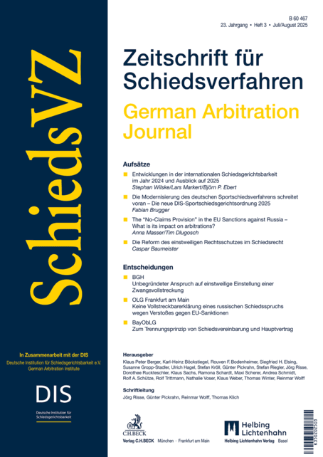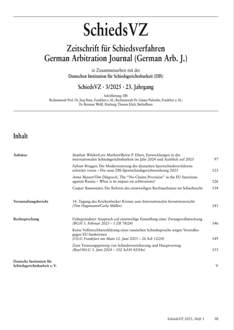Hier finden Sie die Vorschau der SchiedsVZ, Heft 3/2025. Die DIS ist mit dem Verlag C. H. Beck der Herausgeber der Zeitschrift für Schiedsverfahren (SchiedsVZ). Der Bezug der SchiedsVZ ist für DIS-Mitglieder übrigens kostenfrei.