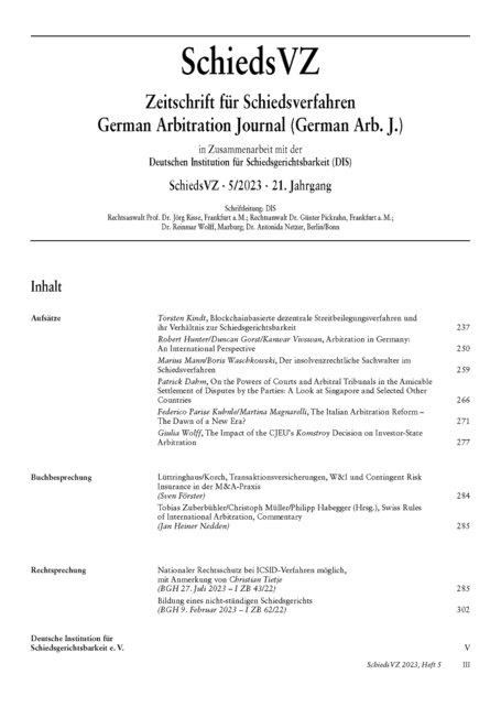 Hier finden Sie das Titelblatt und das Inhaltsverzeichnis der SchiedsVZ, Heft 05/2023. Der Bezug der SchiedsVZ, die im Verlag C. H. Beck erscheint, ist für DIS-Mitglieder übrigens kostenfrei.