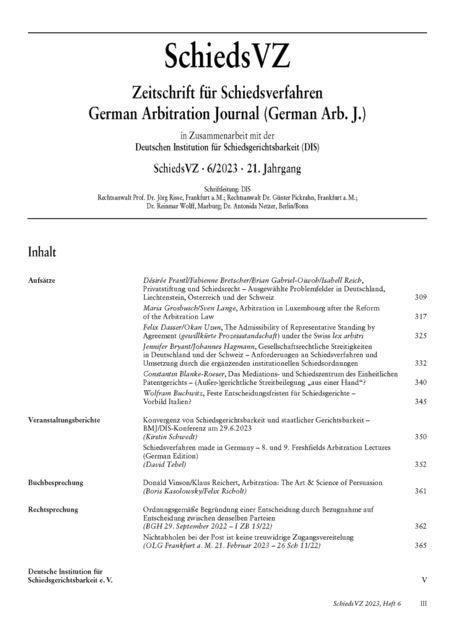 Hier finden Sie das Titelblatt und das Inhaltsverzeichnis der SchiedsVZ, Heft 06/2023. Der Bezug der SchiedsVZ, die im Verlag C. H. Beck erscheint, ist für DIS-Mitglieder übrigens kostenfrei.